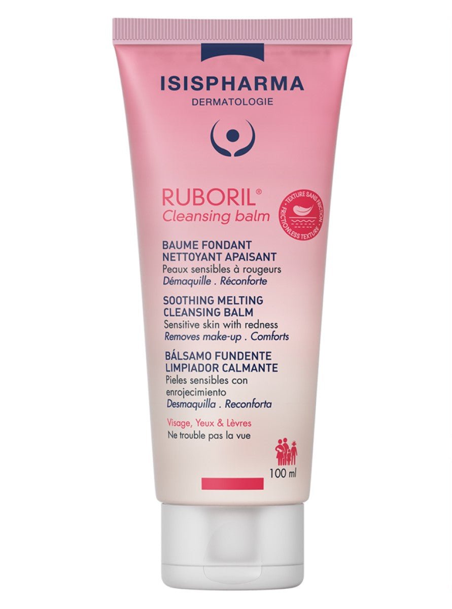 ruboril cleansing balm, bálsamo desmaquillante, piel sensible, enrojecimiento facial, limpiador calmante, rostro ojos y labios, isispharma ruboril, limpieza suave piel delicada, rosácea, bálsamo fundente