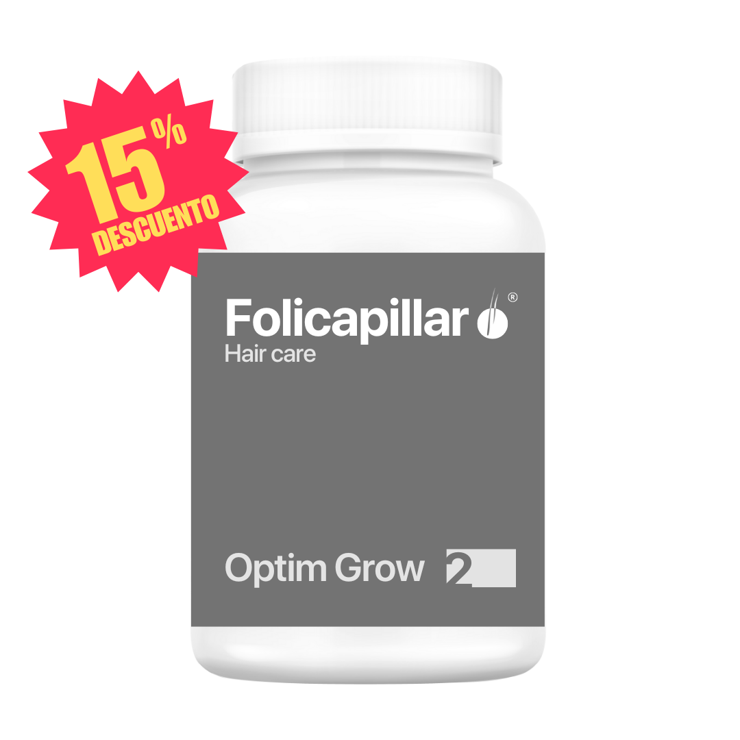 Folicapillar Optim Grow 2 es un suplemento oral con Minoxidil 2.5mg, indicado para combatir la alopecia androgénica en hombres y mujeres. Su acción vasodilatadora favorece el flujo sanguíneo en el cuero cabelludo, estimulando los folículos pilosos para promover el crecimiento de cabello nuevo y fortalecer el existente.