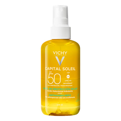 Vichy Capital Soleil Agua Protectora SPF 50 con Ácido Hialurónico es una fórmula bifásica de alta eficacia que protege intensamente la piel contra los rayos UVB, UVA y UVA largos, mientras proporciona una hidratación profunda y duradera. Gracias a su textura ligera tipo agua, deja una sensación refrescante, sin residuos grasos ni pegajosos, ideal para uso diario.